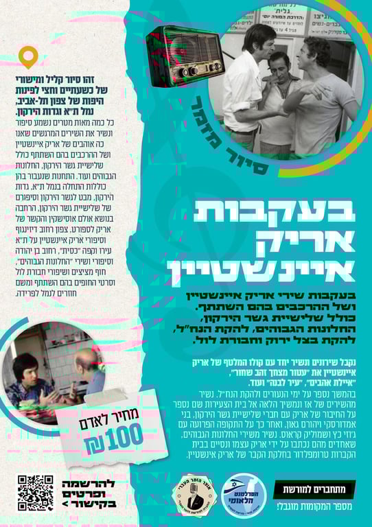 נלך כמה מאות מטרים ונשמע סיפורי חיים על הדמויות המרכזיות שאנו כה אוהבים של אריק איינשטיין ושל החברים בהם השתתף: נעמי שמר, גשר הירקון, החלונות הגבוהים ועוד.